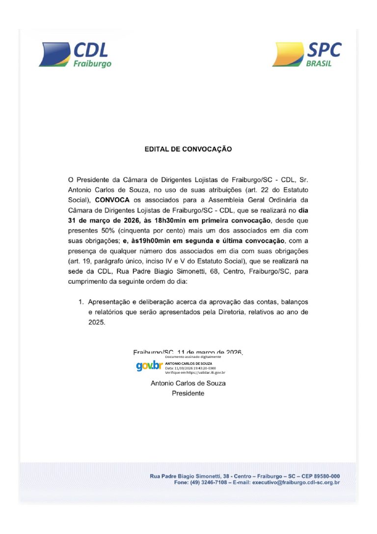 Presidente do CDL Fraiburgo convoca para prestação de contas