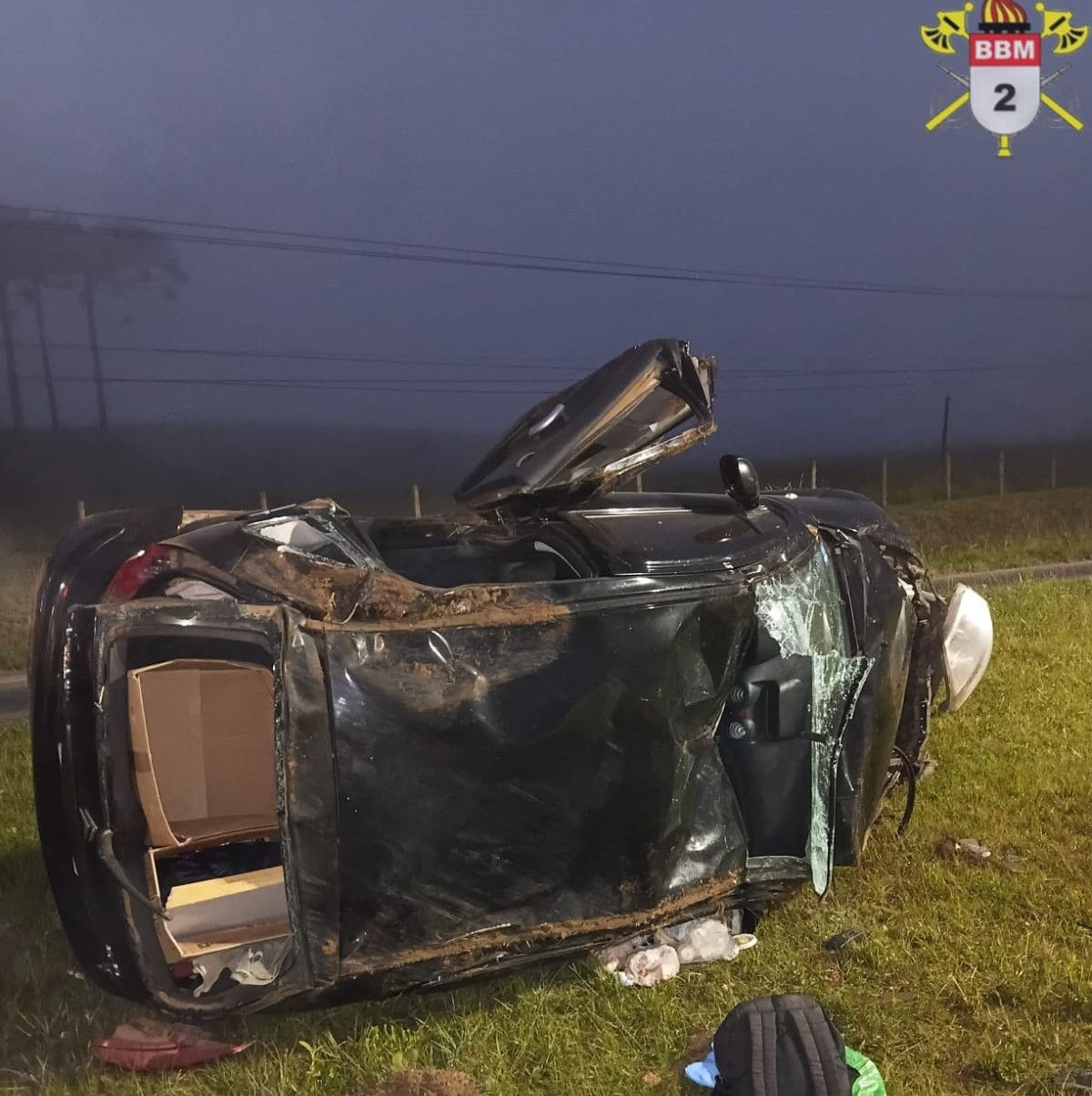 Carro capota após derrapar em brita na SC-135 em Rio das Antas