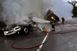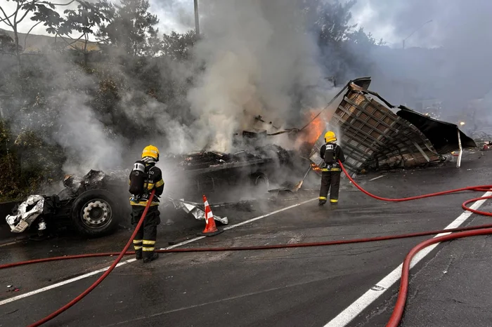 Segundo o 7º Batalhão de Bombeiros Militar (BBM), sediado em Garuva, o acionamento ocorreu às 5h06min para atendimento da colisão entre o caminhão e van, seguida de incêndio, no quilômetro 668 da rodovia. No local, os bombeiros constataram a colisão traseira entre dois caminhões, sendo que um deles também colidiu lateralmente com a van. Tanto o caminhão quanto o veículo de passageiros estavam totalmente tomados pelas chamas quando as equipes chegaram. A guarnição utilizou cerca de 4,5 mil litros de água para extinguir o incêndio. O caminhão envolvido transportava carga diversificada, incluindo geladeiras, carteiras, filtros de óleo, palhas e outros materiais. Durante o atendimento, foi localizado o caminhoneiro encarcerado e já sem vida. Ele era o motorista do primeiro caminhão, cuja cabine havia se desprendido da carreta e ficado comprimida no fundo do segundo veículo.
