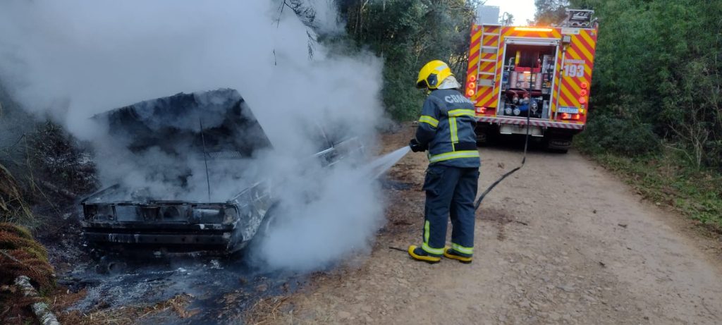 Veículo foi totalmente consumido pelas chamas no interior de Fraiburgo