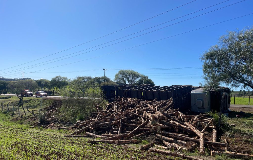 Carreta carregada de toras tomba na SC-355 após problemas nos pneus