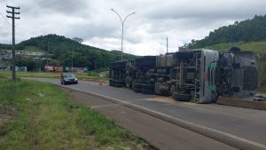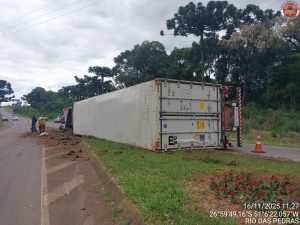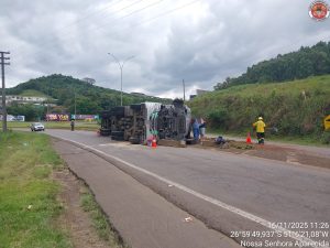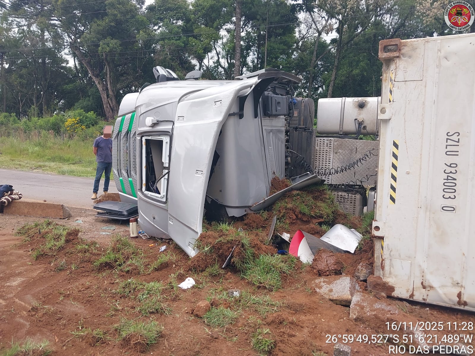 Ao chegarem ao local, os bombeiros encontraram um caminhão trato Iveco tracionando uma carreta, tombado sobre a pista. O veículo era conduzido por um homem de 50 anos, que apresentava um corte no braço esquerdo e relatava dores de cabeça. Segundo a guarnição, o motorista não apresentava sinais de cervicalgia ou lombalgia.