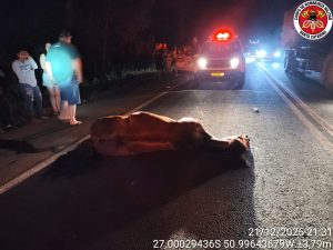 Na noite de domingo, 21 de dezembro de 2025, por volta das 21h11, o Corpo de Bombeiros Militar de Fraiburgo foi acionado via COBOM para atendimento de um acidente de trânsito envolvendo o atropelamento de um animal de grande porte na Rodovia SC-355, nas proximidades da entrada da Linha Papuã, em Fraiburgo.