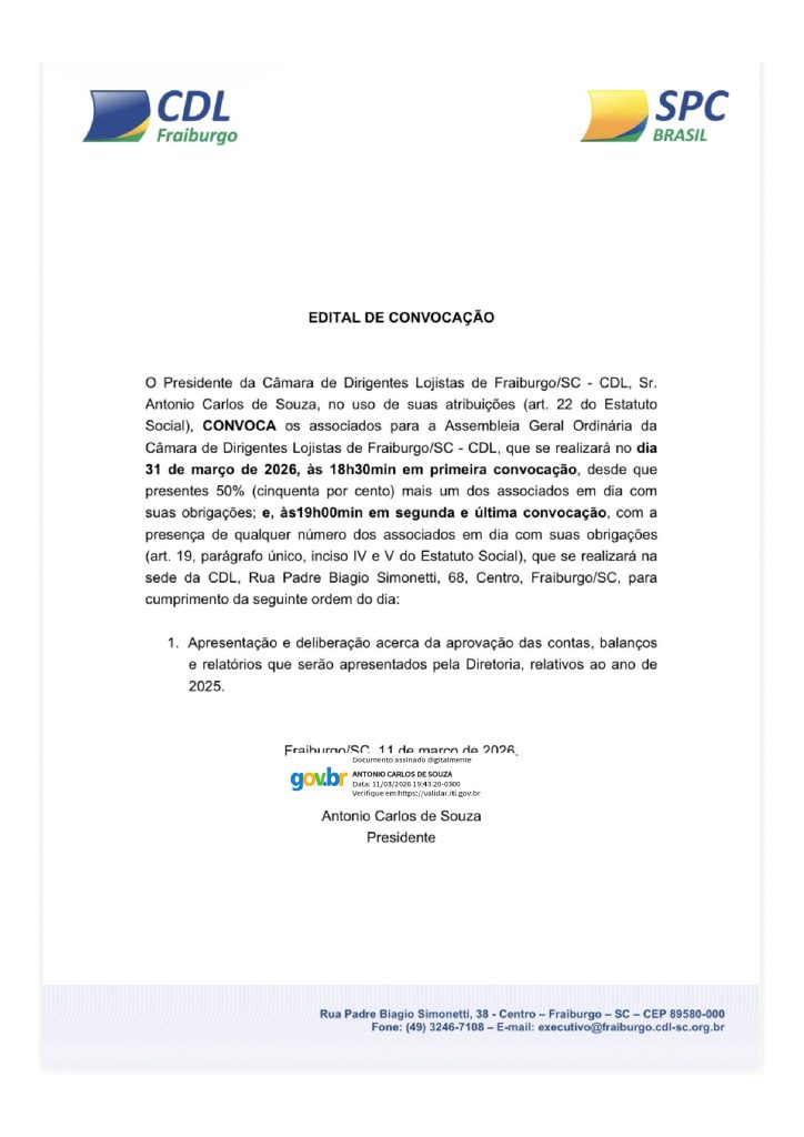 A Câmara de Dirigentes Lojistas de Fraiburgo (CDL Fraiburgo) torna público o edital de convocação referente à prestação de contas do exercício de 2025. O documento apresenta as informações oficiais relacionadas à convocação dos associados, conforme os procedimentos institucionais e estatutários da entidade. A publicação tem como objetivo garantir transparência e manter os associados […]