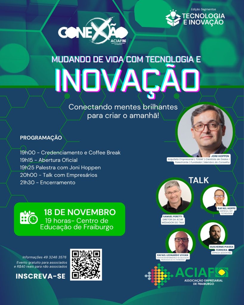 A Associação Empresarial de Fraiburgo (Aciaf) realiza no próximo dia 18 de novembro (terça-feira) mais uma edição do Conexão Aciaf – Edição Segmentos, com o tema “Mudando de Vida com Tecnologia e Inovação”. O evento acontecerá a partir das 19 horas, na Arquibancada do Centro Educacional de Fraiburgo, e promete conectar mentes brilhantes para discutir […]