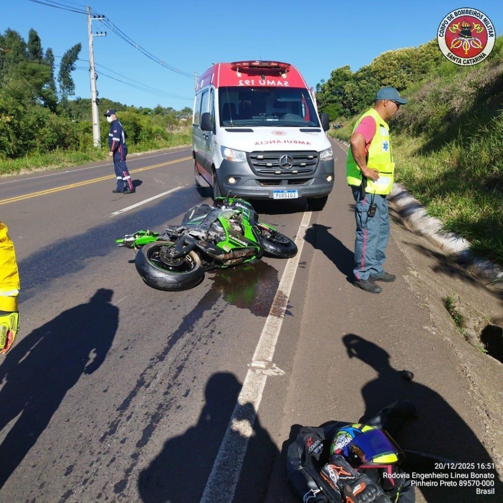 Um grave acidente de trânsito foi registrado na tarde deste sábado, 20 de dezembro de 2025, por volta das 16h38, na Rodovia SC-135, no município de Pinheiro Preto, nas proximidades da antiga Cantina Casal Picoli. O Corpo de Bombeiros Militar de Tangará foi acionado para atender a ocorrência e, ao chegar ao local, constatou uma […]