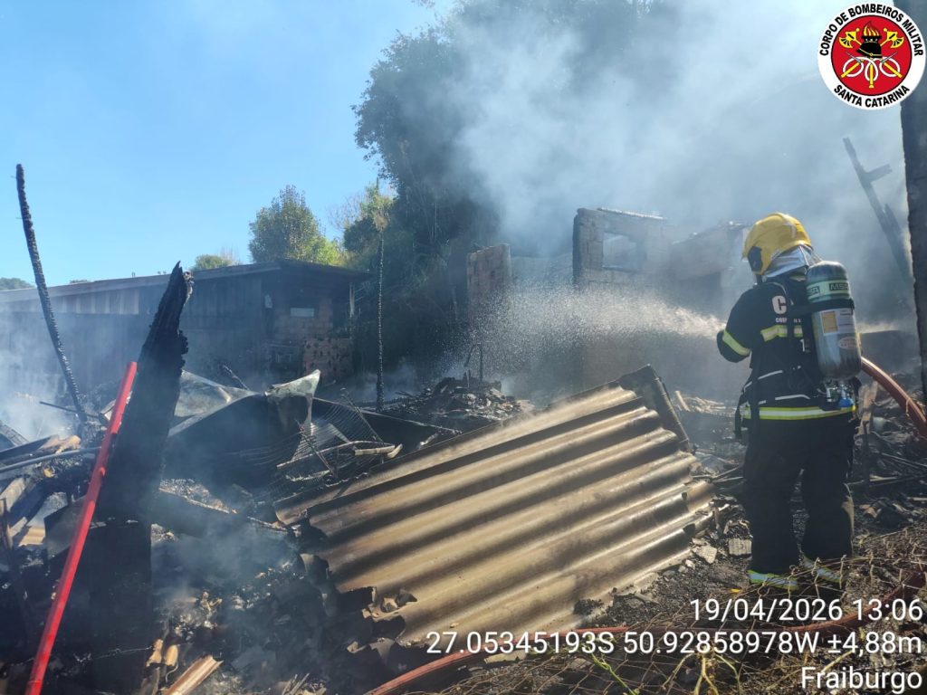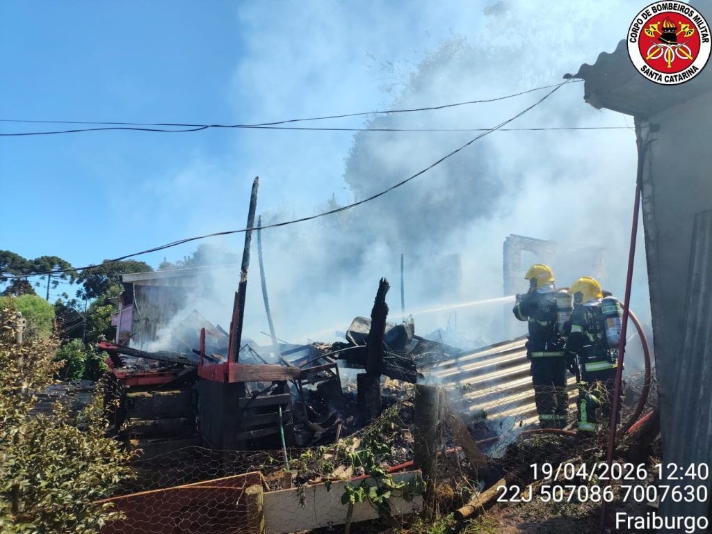 Um incêndio em residência mobilizou equipes do Corpo de Bombeiros Militar no início da tarde deste domingo, 19 de abril de 2026, por volta das 12h01min, no município de Fraiburgo, no Meio-Oeste catarinense.