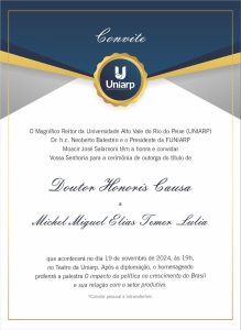 O Conselho Universitário (CONSUN) da Universidade Alto Vale do Rio do Peixe (UNIARP) aprovou por unanimidade a concessão do título de Doutor “Honoris Causa” ao ex-presidente da República, Dr. Michel Miguel Elias Temer Lulia. A cerimônia de outorga ocorrerá no dia 19 de novembro de 2024, às 17h30, em sessão solene no Teatro da UNIARP, com entrada gratuita.
